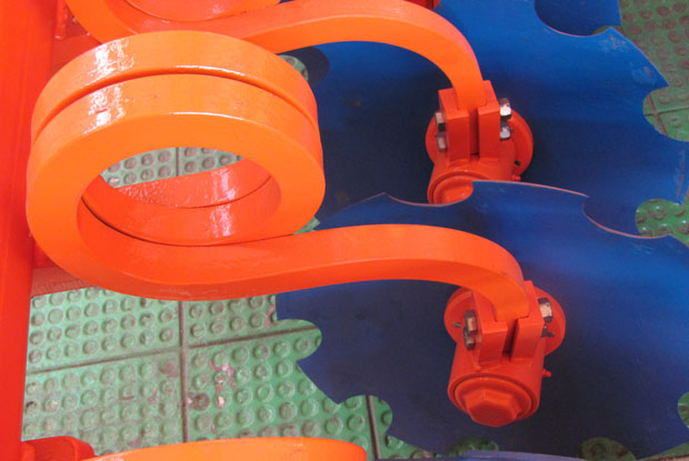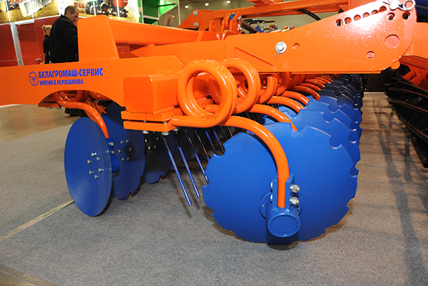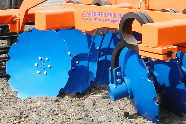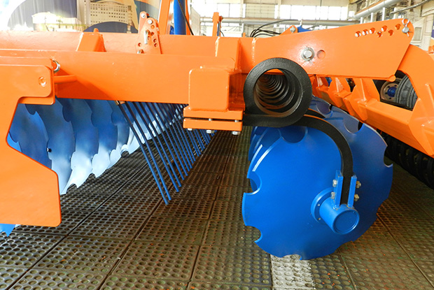 - Благодаря пружинной подвеске режущего узла диск совершает низкочастотные колебательные движения, при которых происходит его самоочистка от налипшей грязи, при этом исключается забивание междискового пространства, а также снижению тягового усилия трактора отпадает необходимость применения в конструкции чистиков.