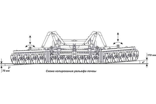 - В рамной конструкции бороны заложено копирование рельефа поля при обработке почвы. Копирование происходит в двух направлениях: плоскопараллельное перемещение боковой рамы относительно центральной, а также наклон боковой рамы с положительным и отрицательным градусом относительно оси ее крепления (см. схему).