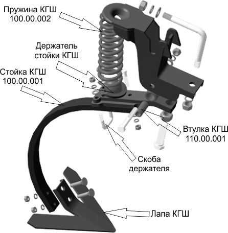 - Корпус культиватора КГШ - представляет собой уникальный запатентованный узел, состоящий из крепёжно-регулирующего и пружинного механизма, которая в свою очередь состоит из двух типов пружин, спиралевидная (диаметр 12мм.) и С-образная (дуговая с сечением 20x45).