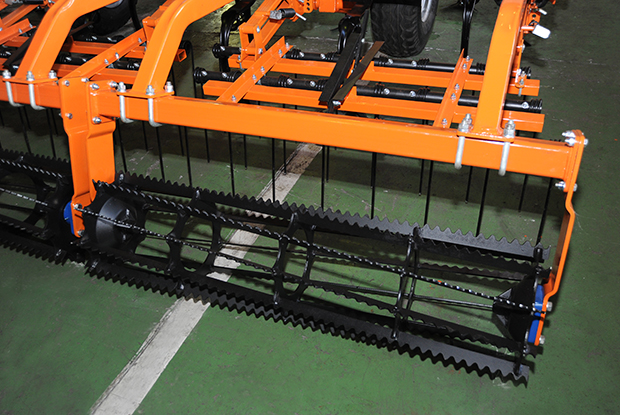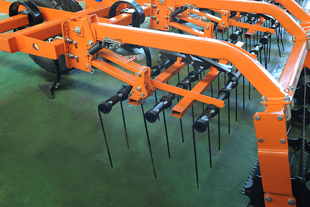 - На культиватор устанавливается три ряда пружинных зубьев с регулируемым углом атаки. Секции с зубьями подпружинены, что обеспечивает точное копирование рельефа.