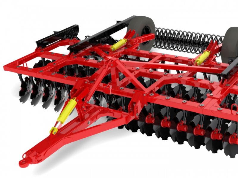 -Механизм опорного катка позволяет регулировать глубину обработки почвы вне зависимости от углов атаки дисков (от 5 до 15 см).