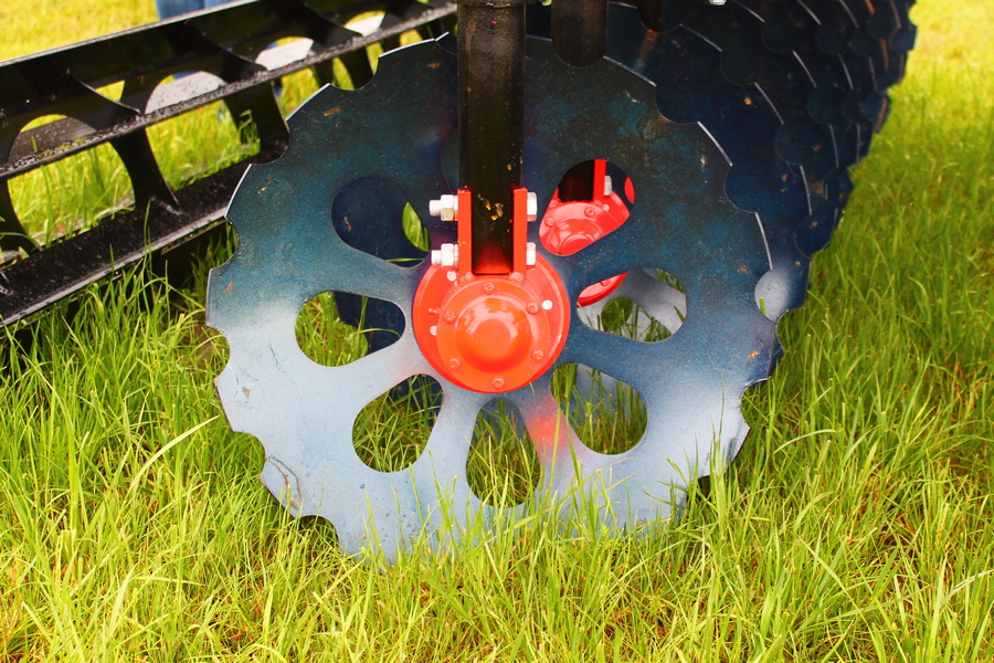 -Диск “Ромашка“ и диск "DROP" изготовлены, из бор-содержащей стали 65г Æ 560 мм, толщиной 6 мм, с шестью отверстиями под ступицу режущего узла, установлены наклонно, на индивидуальных стойках 58мм с обслуживаемым соединением, с изменением угла атаки дисков синхронно в каждом ряду.