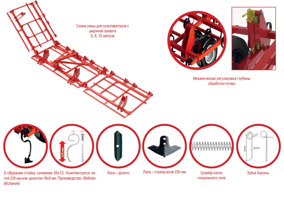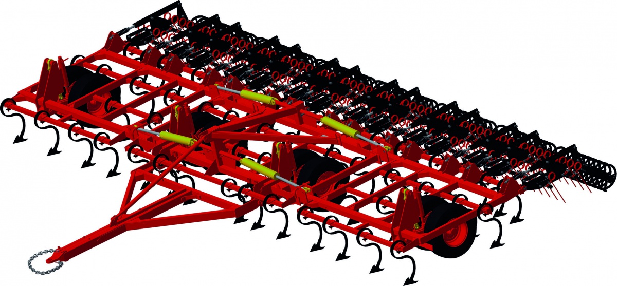 - Вариантов комплектаций несколько: с одинарным или двойным шлейф-катком (спиральным) и штригельной бороной, а также лапами-перьями (долотьями) для выравнивания зяби.