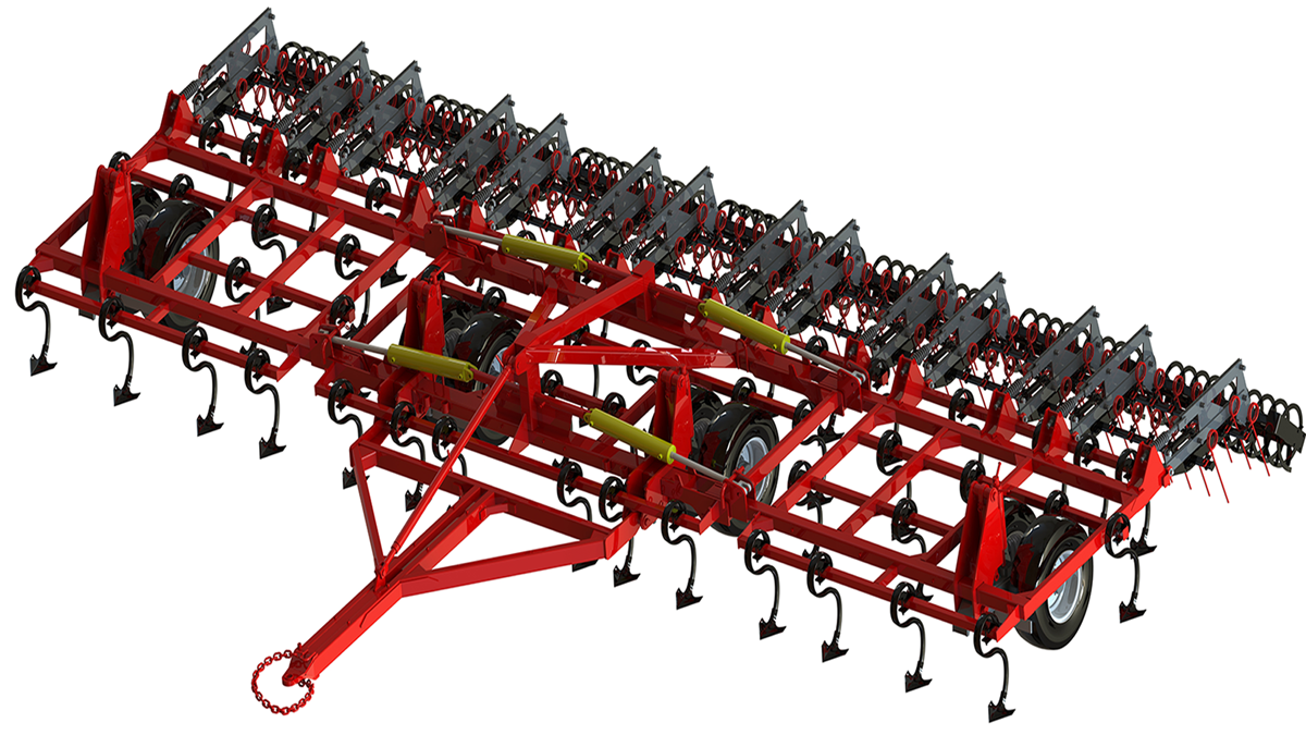 - Четырехрядное расположение пружинных S-образных стоек Bellota, высотой 520 мм шириной 45 мм, или 65мм, лапой-стрелой 150, 200, или 230 позволило снизить забиваемость орудия при работе по полям с большим количеством растительных остатков и снижается сопротивляемость.