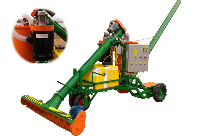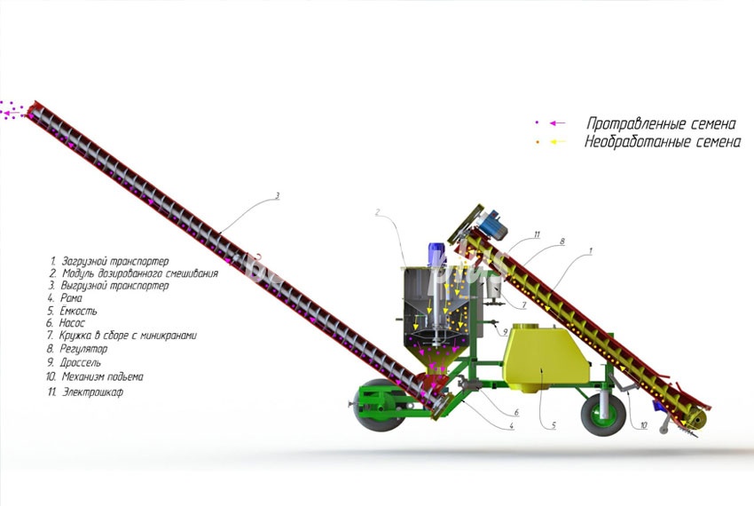 - длина выгрузного шнека составляет 4,4 м, что позволяет выгружать протравленные семена в машины с наращенными бортами;