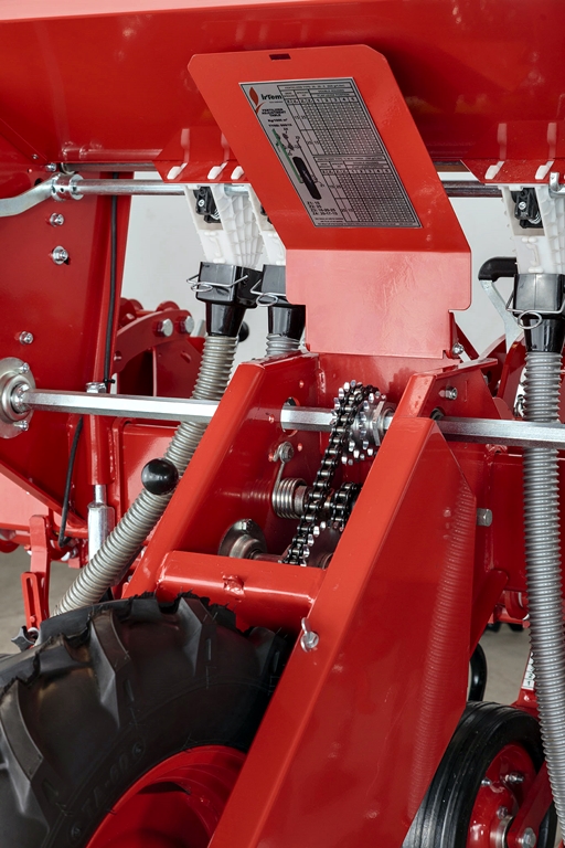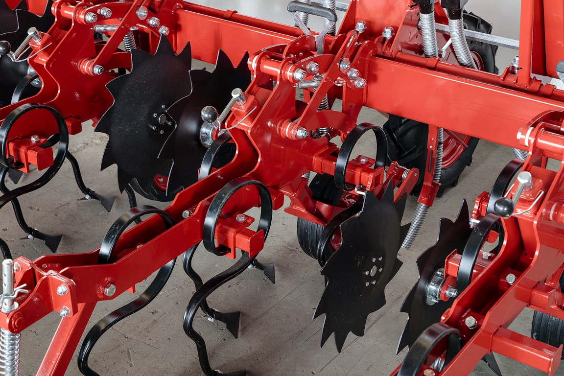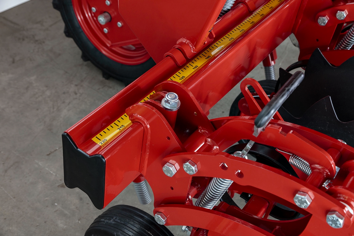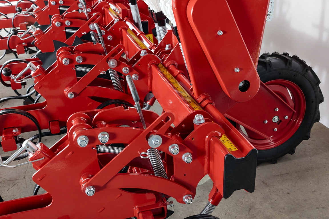 - Регулируемое расстояние между секциями (рядами) и настройки глубины, движутся независимо друг от друга (независимо от оси и направляющих шасси, регулируемые пружины для максимальной производительности на всех поверхностях, регулируемые ножки для удобрений в местах налива.