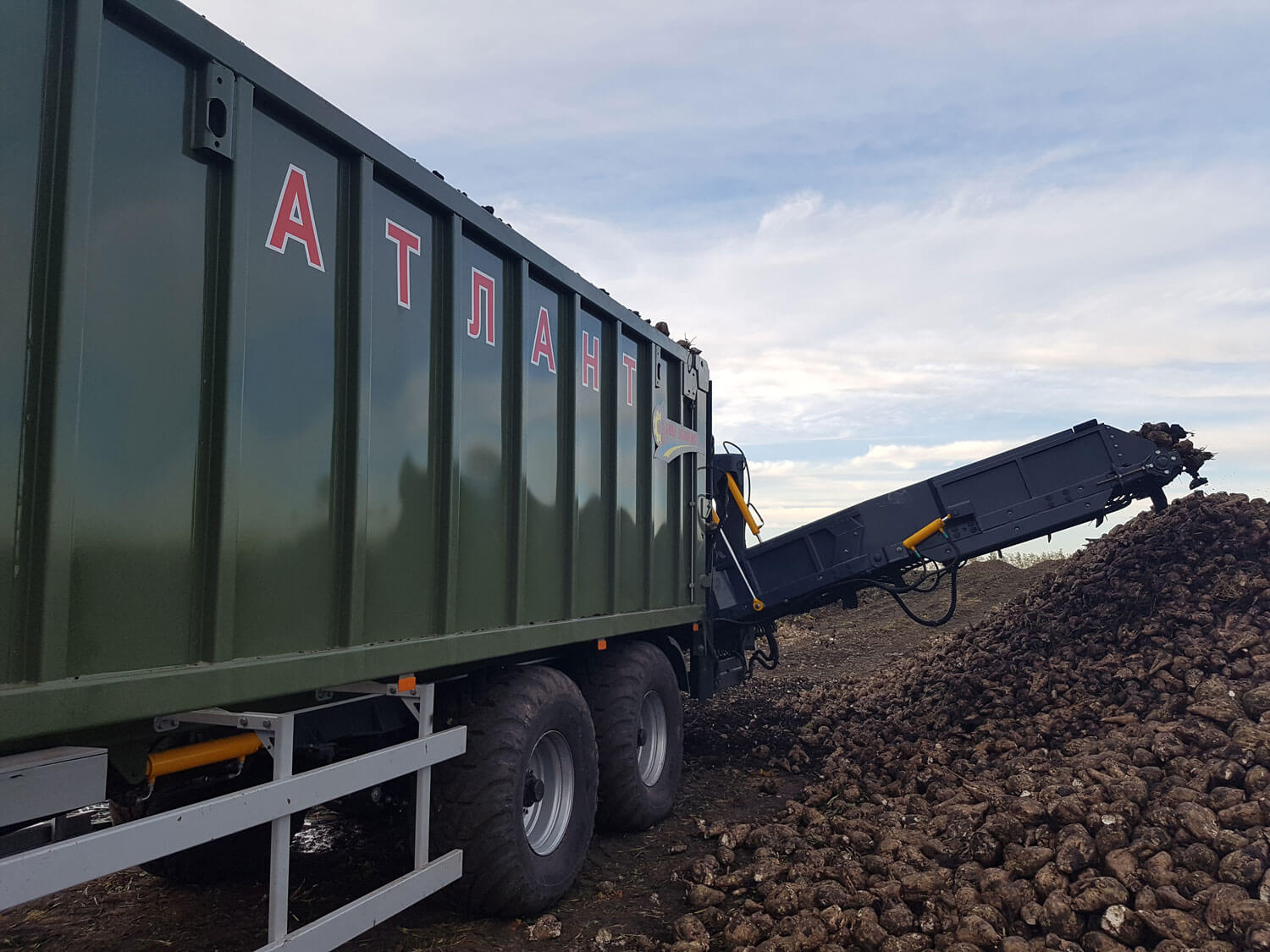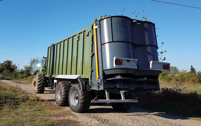- Используется, как перегрузочный бункер-накопитель для вывоза зерна от комбайна на край поля и перегрузки в зерновозы, для этого нужно лишь заменить задний борт на борт со шнеком;