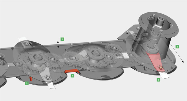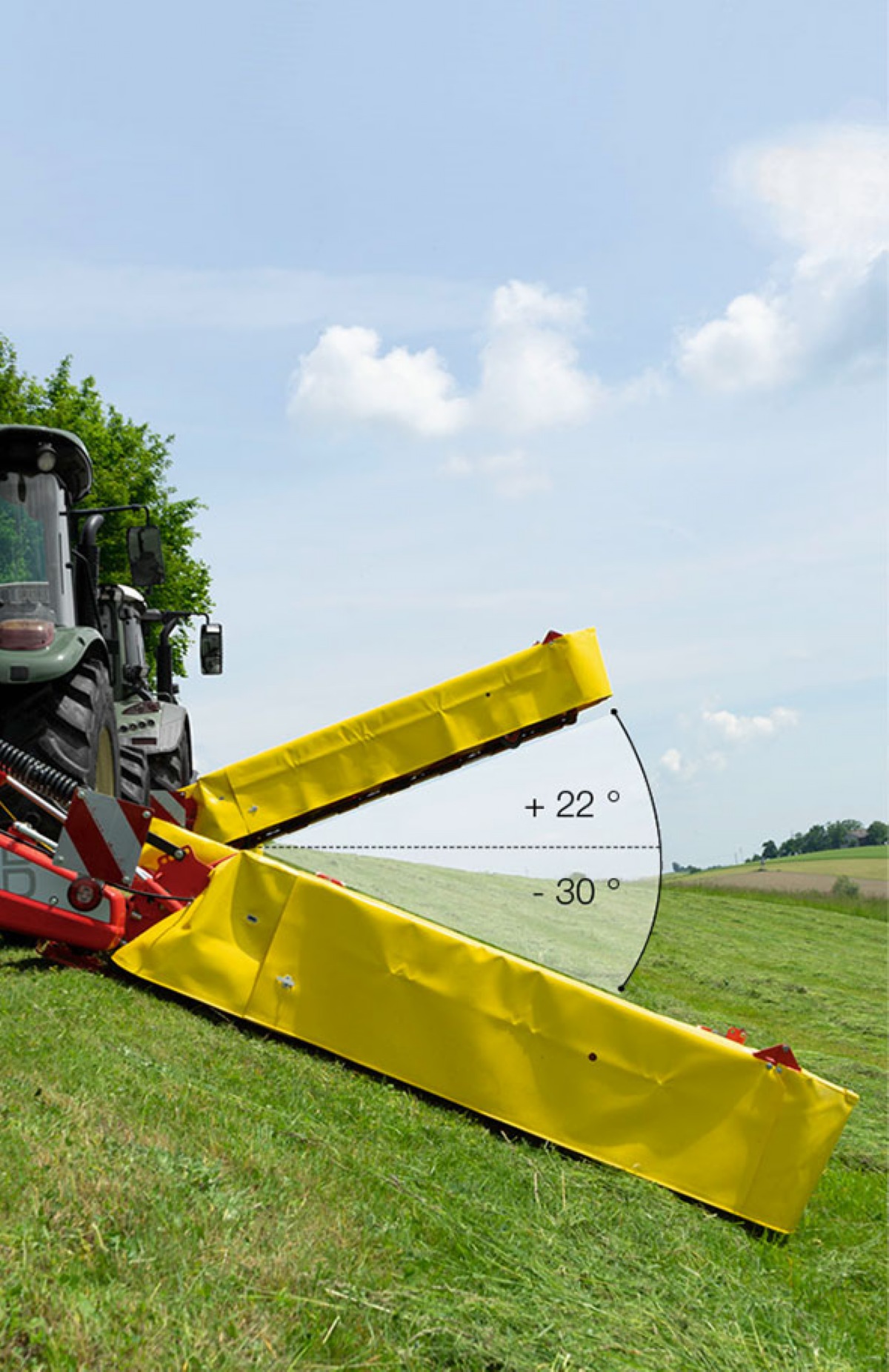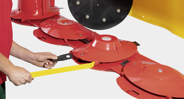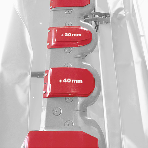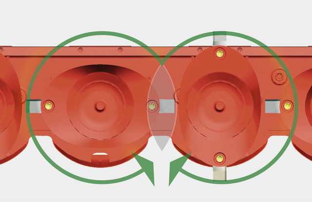 Две разгрузочный пружины гарантируют снижение давления косилочной балки. Разгрузка осуществляется в трех положениях без помощи инструментов. Уникальная кинематика гарантирует, что вес косилочной балки равномерно распределяется на поверхность по всей ширине. Давление опоры может с гибкостью подстраиваться под индивидуальные условия эксплуатации. Это снижает износ и энергопотребление.