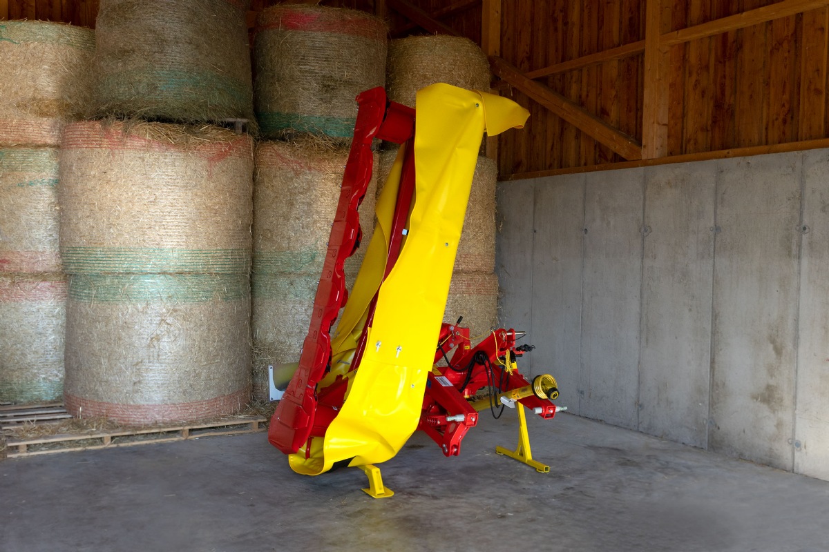 Оптимизированный центр тяжести машины обеспечивает безопасную и компактную транспортировку по дорогам. В транспортном положении косилка откидывается на 102°. Таким образом оба зеркала заднего вида дают свободный обзор сзади. С помощью опционального гидравлического откидывания боковой защиты вы получаете минимальную транспортную высоту.
