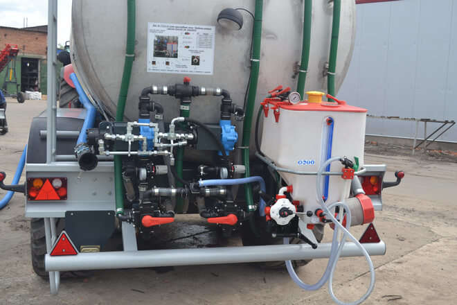 Для очистки бочки от остатков пестицида применяются спринклерные омыватели. Чистая вода подается под давлением 6 атмосфер очищая бочку перед следующей партией пестицида, без примесей предыдущего препарата.