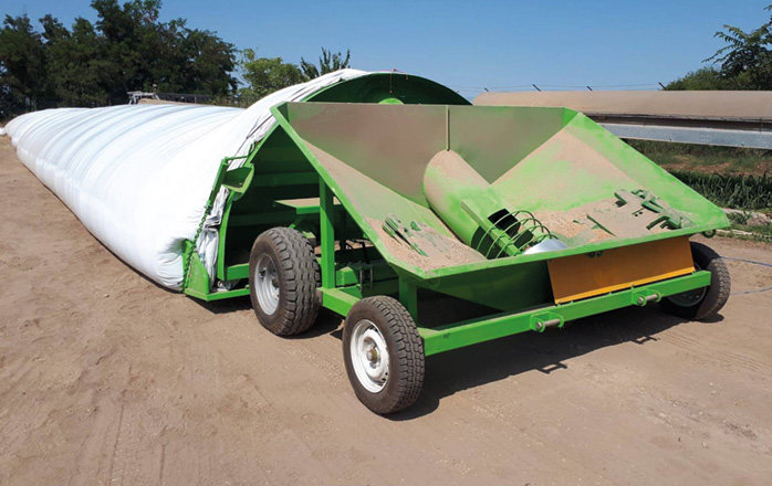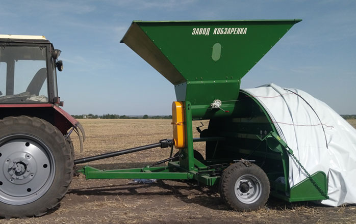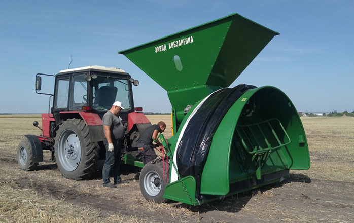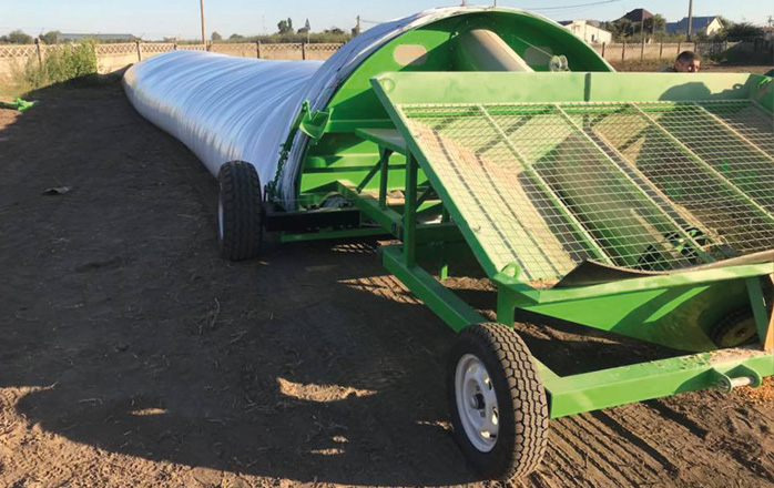 Шнековый механизм зерноупаковочной машины движется за счет трактора, работающего на холостых оборотах. Он предназначен для того, чтобы зерновые культуры плотно набивать в полимерные рукава.