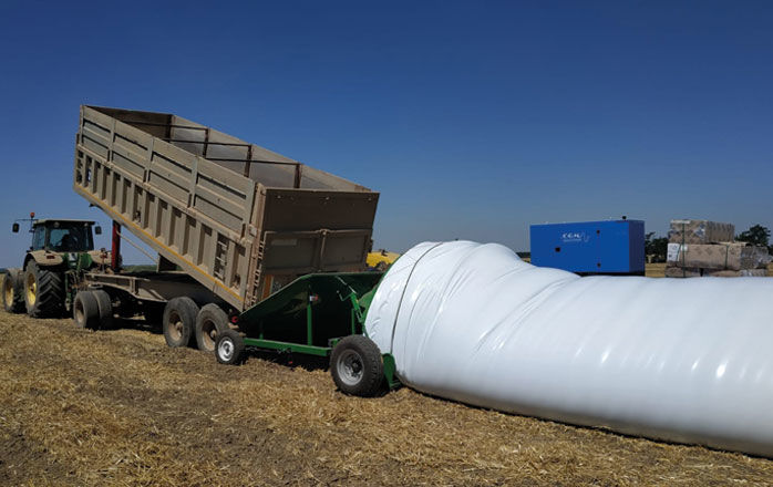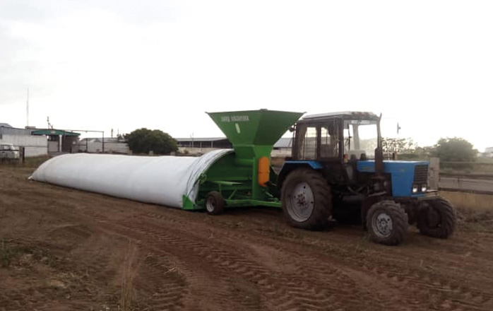 Зерноупаковщик и трактор, под давлением зерна, загружаемого в приемный бункер, движутся вперед, а набитый рукав остается на своем месте.
