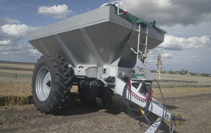 3. Для равномерного распределения минеральных удобрений, соблюдения постоянной нормы внесения и ширины захвата используется гидравлический механизм привода тарелок через редукторы, производства Бондиоли и Павези (Италия) с регулированием потока масла, что позволяет установить постоянную частоту вращения тарелок независимо от оборотов двигателя трактора. Подача минеральных удобрений- от транспортера к ценру разбрасывательного диска, имеет особые преимущества так как, скорость вращения в этом секторе ниже и травмирование удобрений минимальное, при этом обеспечивается плавное центробежное ускорение. Это имеет решающее значение для точного внесения;