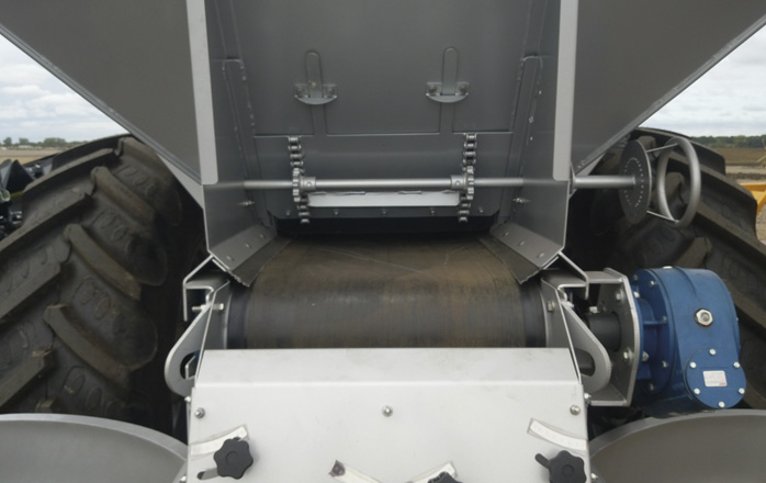 1. Транспортер планочный, обеспечивает подачу любых удобрений даже слежавшихся, без зависания в кузове, дополнительно измельчая комки при подаче. Привод транспортера от колеса разбрасывателя обеспечивает полную зависимость количества минудобрения подаваемого на тарелки соответствии со скоростью движения агрегата. Для больших норм внесения удобрений привод транспортера можно установить от ВОМ трактора (опция);